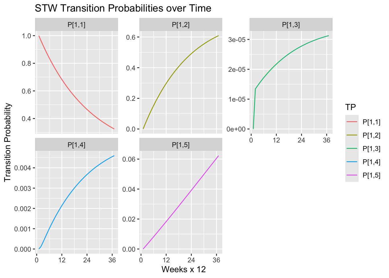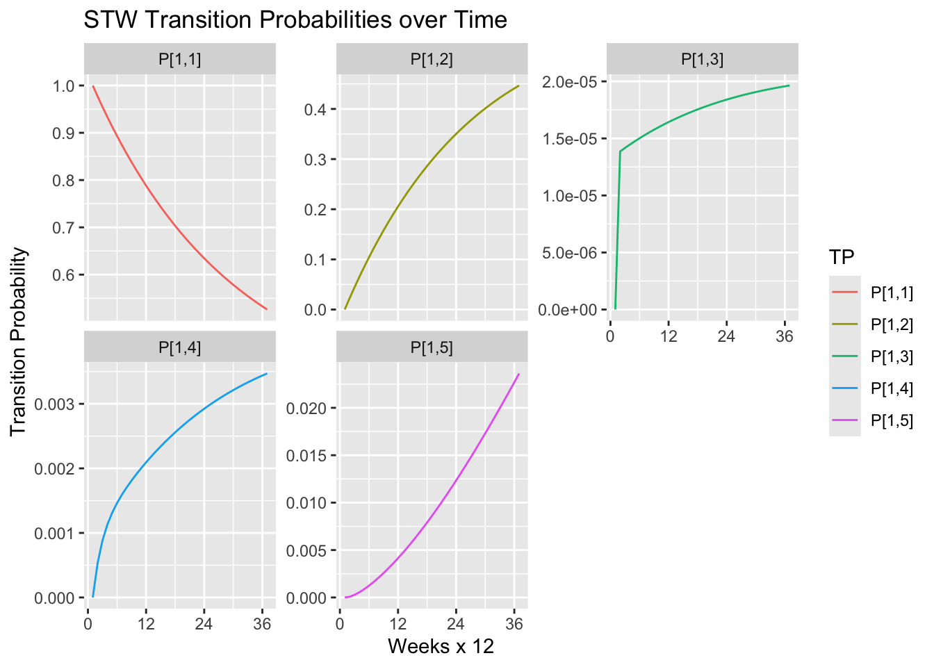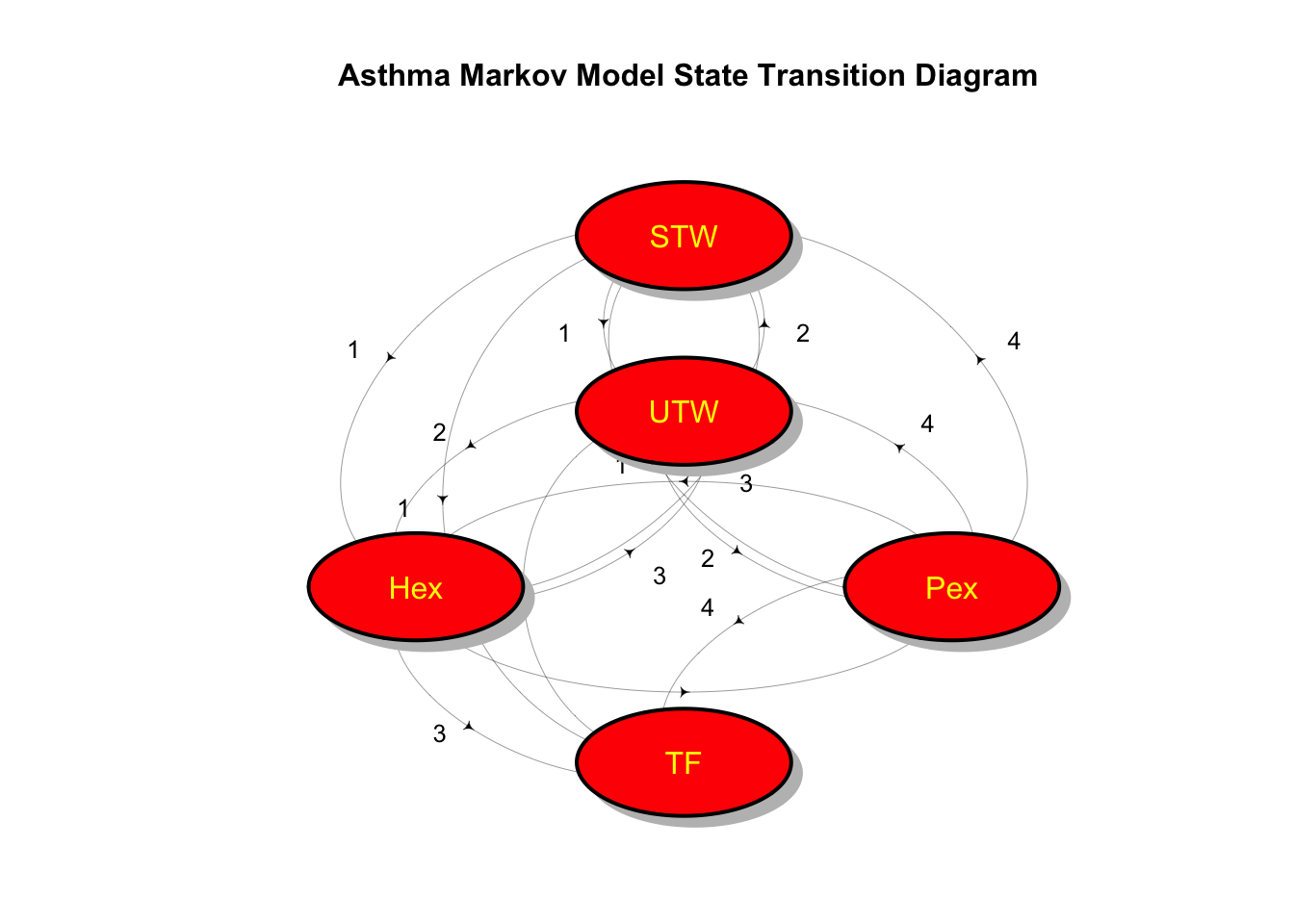The following diagram illustrates the 5-state, absorbing Markov chain framework used to model the progression of patients through various health states as they undergo treatment for asthma. The states are defined as follows: STW= successfully treated week, UTW= unsuccessfully treated week, Hex= hospital-managed exacerbation, Pex= primary care-managed exacerbation, and TF= treatment failure. In the previously published post, A Simple Bayesian Multi-state Survival Model for a Clinical Trial, I followed Welton et al. (2010) by using a discrete-time Markov model to compare the effectiveness of two asthma treatments. In this post, I fit a continuous-time Markov chain (CTMC) to the same data.