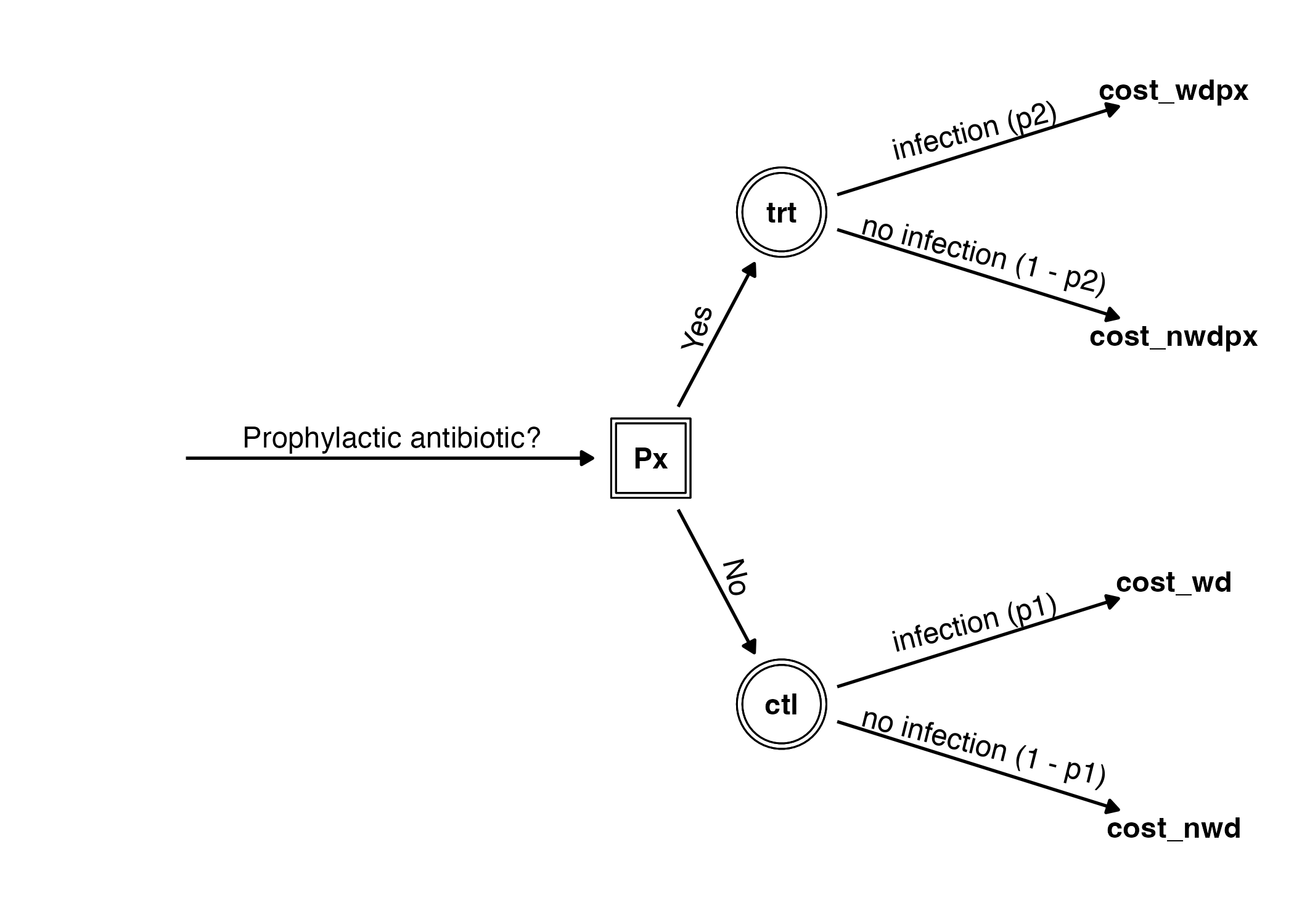 The following figure depicts the decision as a tree. The decision of whether or not to prescribe prophylactic antibiotics is represented by the square node labelled Px. The two branches from this node represent the treatment and control groups. These groups are represented as circles because they are “chance nodes”; people in those groups may or may not go on to get a wound infection. The probability of infection is different for each group (p1 and p2). The four leaves of the tree are the four possible outcomes: getting a wound infection or not in either the treatment or the control. We can compute a cost for each outcome. For example, the most expensive outcome is for patients who received the antibiotic and got an infection anyway because they have both the costs of providing the prophylaxis and the costs of treating the wound. Though not shown on the diagram, we can also compute a utility (in QALYs) for each outcome (e.g., time a patient spends in the hospital is not as valuable as time spent otherwise). The expected cost and utility of each main branch are a probability-weighted average of the costs and utilities of the leaves of that branch.