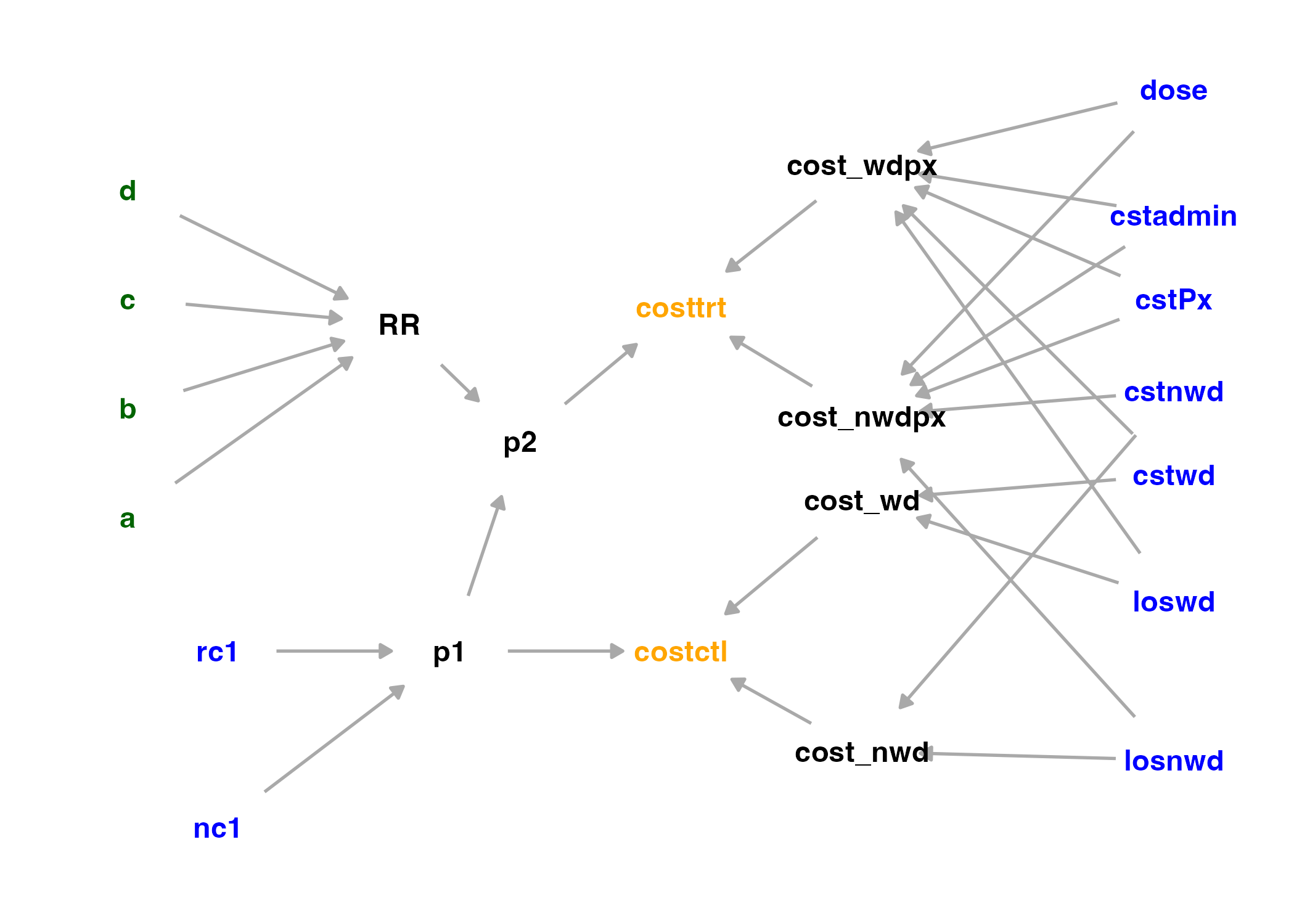 stochastic_data <-list(rc1 =41, nc1 =486, cstwd =163.03, cstnwd =107.26,mnloswd =8.8, sdloswd =3.5,mnlosnwd =6.7, sdlosnwd =7.1,numwd =41, numnwd =445, # !!! numwd == rc1; numnwd == (nc1 - rc1)cstPx =5.67,# rt=4, nt=133, rc=28, nc=136, # !!! Unused variablesa =4, b =129, c =28, d =108)# Here I code the changes from the data for the deterministic model to the # data for the stochastic one, in case that makes the differences easier to see.# Add these:# setdiff(names(stochastic_data), names(deterministic_data))# "mnloswd" "sdloswd" "mnlosnwd" "sdlosnwd"# "numwd" == rc1;# "numnwd" == (nc1 - rc1)# # Remove or rename these:# setdiff(names(deterministic_data), names(stochastic_data))# "loswd" -> "mnloswd"# "losnwd" -> "mnlosnwd"# "cstadmin" hard-coded uniform distribution# "dose": hard-coded !!!# uncertainty <- c(sdloswd=3.5, sdlosnwd=7.1) # standard deviations from Table 3.4# rename_me <- c("loswd"="mnloswd", "losnwd"="mnlosnwd")# # stochastic_data <- append(deterministic_data, uncertainty)# for (old_name in names(rename_me)){# new_name <- rename_me[[old_name]]# names(stochastic_data)[names(stochastic_data) == old_name] <- new_name# }# stochastic_data["cstadmin"] <- NULL # now coded as uniform random# stochastic_data["dose"] <- NULL # the 3 is hard coded now# # stochastic_data["numwd"] <- stochastic_data["rc1"]; # stochastic_data["numnwd"] <- with(stochastic_data, (nc1 - rc1))parameters_to_save <-c("cst.trt", "cst.ctl", "diff.cost")