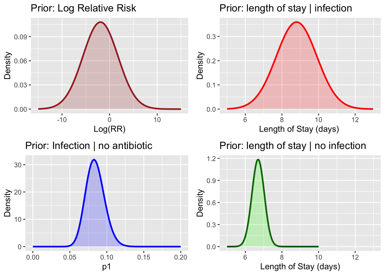 ## Prior Distribution for log Relative Riska <- stochastic_data$ab <- stochastic_data$bc <- stochastic_data$cd <- stochastic_data$dtheta <-log((a / (a + b)) / (c / (c + d)))# thetaprec <-1/ ((1/ a) - (1/ (a + b)) + (1/ c) - (1/ (c + d)))# precvar <-1/ prec# var# Generate a sequence of x valuesx <-seq(-15, 15, length.out =100)# Compute the corresponding beta density valueslnRR <-dnorm(x, theta, prec)# Create a data frame for ggplot2norm_data <-data.frame(x = x, y = lnRR)# Plot the beta distributionq1 <-ggplot(norm_data, aes(x = x, y = lnRR)) +geom_line(color ="brown", linewidth =1) +geom_area(fill ="brown", alpha =0.2) +labs(title ="Prior: Log Relative Risk",x ="Log(RR)",y ="Density" )### Prior Distribution for p1# Define the beta distribution parametersalpha <- stochastic_data$rc1beta <- stochastic_data$nc1 - stochastic_data$rc1# Generate a sequence of x valuesx <-seq(0, .2, length.out =100)# Compute the corresponding beta density valuesy <-dbeta(x, alpha, beta)# Create a data frame for ggplot2beta_data <-data.frame(x = x, y = y)# Plot the beta distributionq2 <-ggplot(beta_data, aes(x = x, y = y)) +geom_line(color ="blue", linewidth =1) +geom_area(fill ="blue", alpha =0.2) +labs(title ="Prior: Infection | no antibiotic",x ="p1",y ="Density" )### Prior distribution for length of stay, wound infection# Define the normal distribution parametersmean <- stochastic_data$mnloswdsd <- stochastic_data$sdlosnwd /sqrt(stochastic_data$numwd)# Generate a sequence of x valuesx <-seq(5, 15, length.out =100)# Compute the corresponding beta density valuesy <-dnorm(x, mean, sd)# Create a data frame for ggplot2norm_data <-data.frame(x = x, y = y)# Plot the beta distributionq3 <-ggplot(norm_data, aes(x = x, y = y)) +geom_line(color ="red", linewidth =1) +geom_area(fill ="red", alpha =0.2) +xlim(5, 13) +labs(title ="Prior: length of stay | infection",x ="Length of Stay (days) ",y ="Density" )## Prior distribution for length of stay, no wound infection# Define the normal distribution parametersmean <- stochastic_data$mnlosnwdsd <- stochastic_data$sdlosnwd /sqrt(stochastic_data$numnwd)# Generate a sequence of x valuesx <-seq(5, 10, length.out =100)# Compute the corresponding beta density valuesy <-dnorm(x, mean, sd)# Create a data frame for ggplot2norm_data <-data.frame(x = x, y = y)# Plot the beta distributionq4 <-ggplot(norm_data, aes(x = x, y = y)) +geom_line(color ="darkgreen", linewidth =1) +geom_area(fill ="green", alpha =0.2) +xlim(5, 13) +labs(title ="Prior: length of stay | no infection",x ="Length of Stay (days)",y ="Density" )grid.arrange(q1, q3, q2, q4)