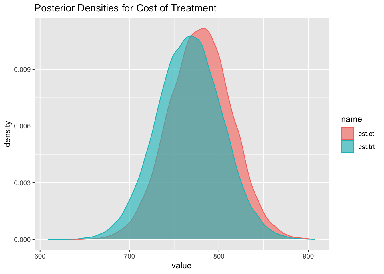 w1 <-plot_densities_from_coda_df(c("cst.trt", "cst.ctl"), coda_df) +ggtitle("Posterior Densities for Cost of Treatment")w1