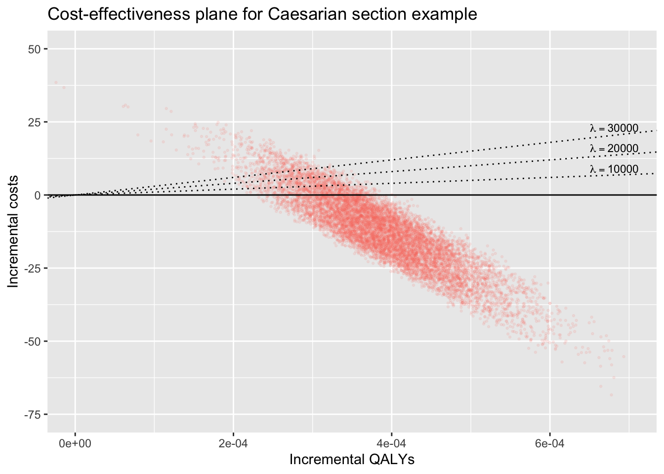XLIM <-c(0, 7e-4) # use same limits as chapter 3YLIM <-c(-75, 50)LAMBDAS <-10000* (1:3)CE_1 <- ce_df %>%ggplot(aes(x = diff.QALYs, y = diff.cost, col = chain)) +geom_point(size =0.5, alpha =0.1) +geom_abline(slope =0, intercept =0, linetype ="solid") +geom_abline(slope = LAMBDAS, intercept =0, linetype ="dotted") +theme(legend.position ="none") +labs(x ="Incremental QALYs", y ="Incremental costs", title ="Cost-effectiveness plane for Caesarian section example") +coord_cartesian(xlim = XLIM, ylim = YLIM) +annotate("text",x = XLIM[2], y = LAMBDAS * XLIM[2],size =3, hjust =0.8, vjust =-0.25,label =paste("lambda ==", LAMBDAS), parse =TRUE )CE_1