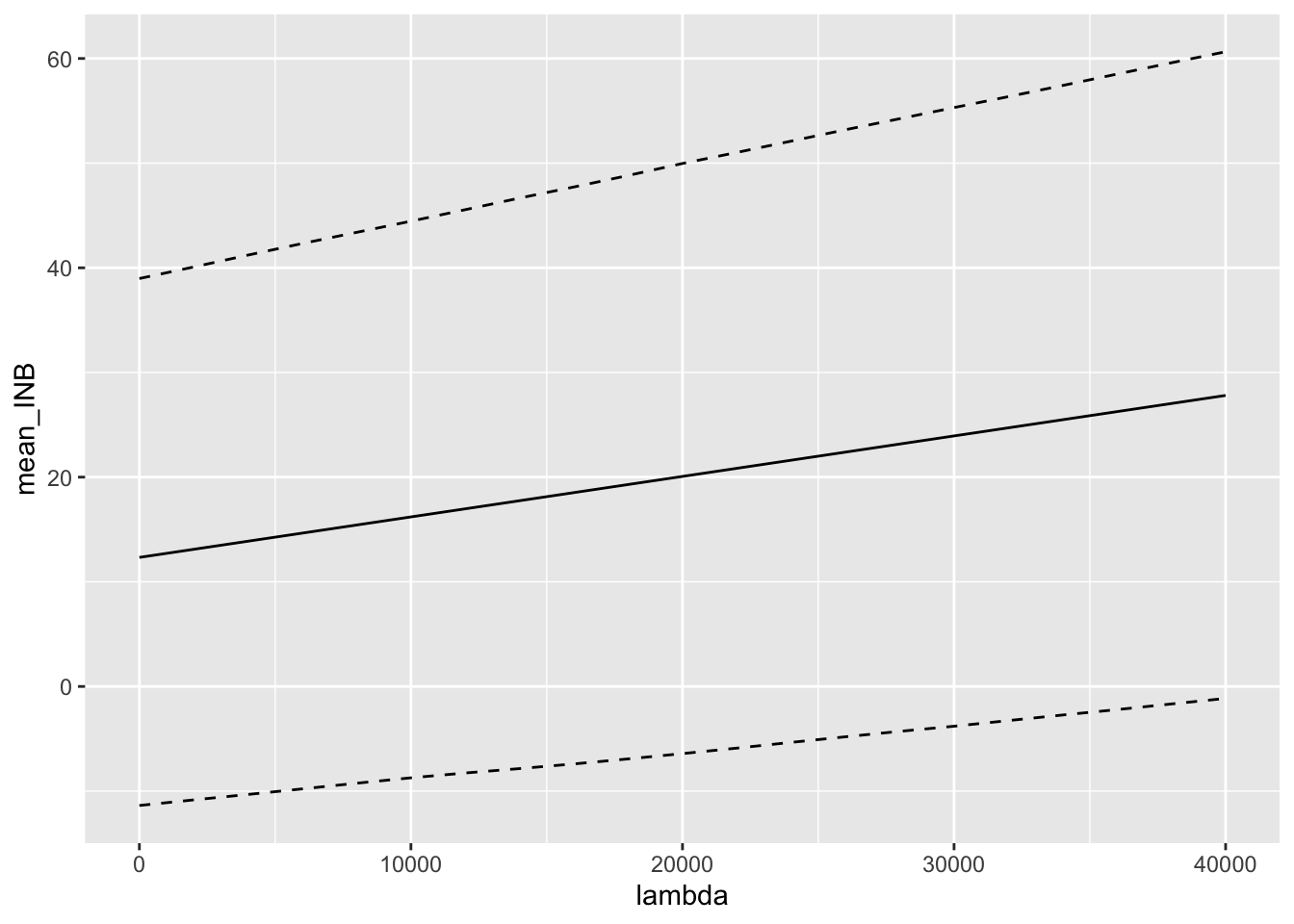 Our final plot shows the expected incremental net benefit and 95% credible interval for a range of lambda values. The x-axis represents the value of lambda and the y-axis represents the expected incremental net benefit. The dashed lines represent the 2.5% and 97.5% quantiles of the posterior distribution of the incremental net benefit.