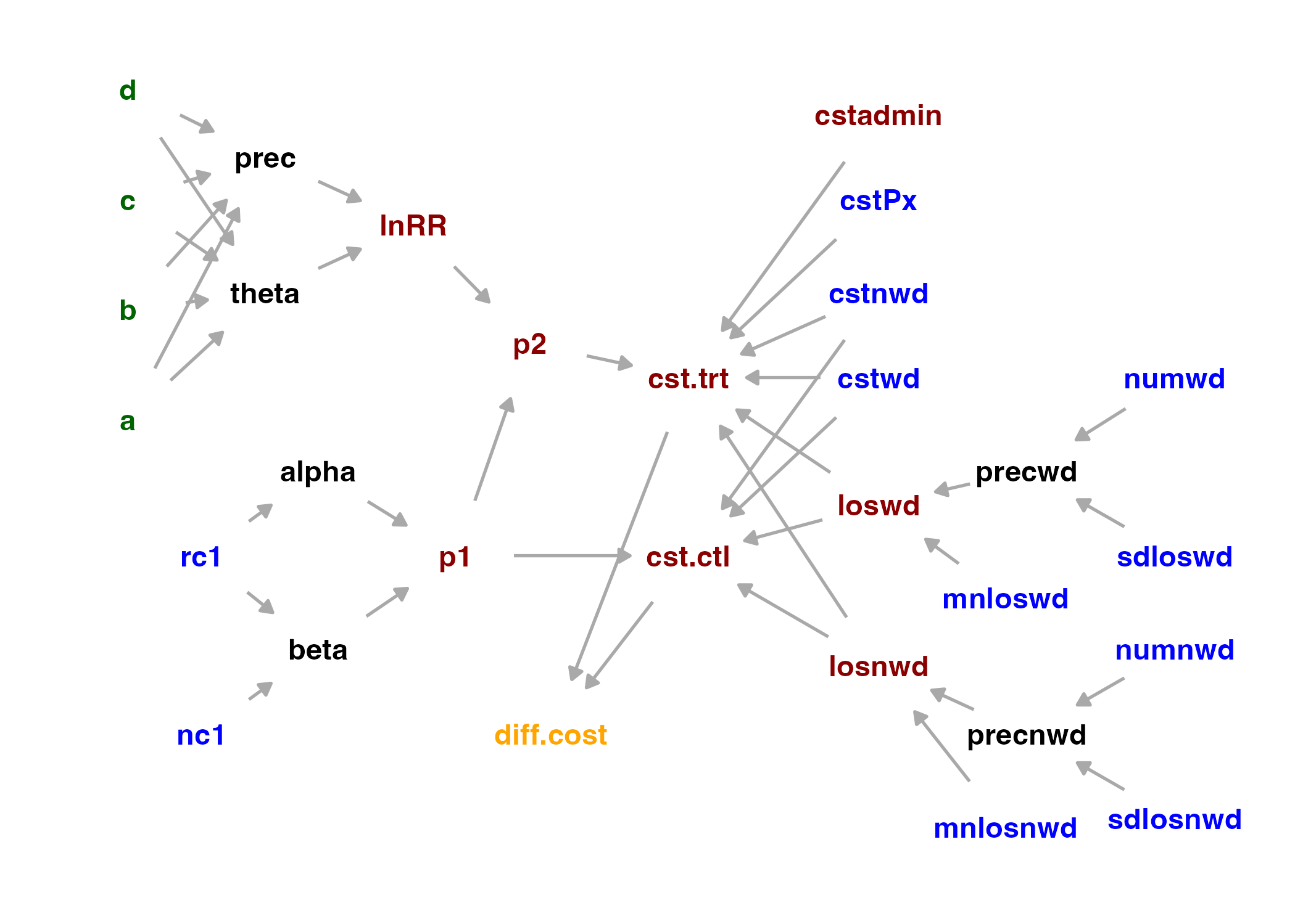 This diagram shows the relationships between variables in the stochastic model. The red nodes are stochastic variables, as is the orange outcome node (differential cost). These depend on parameterized random distributions. For example, the relative risk (RR) and prevalence of infection in the target hospital (p1) are no longer simple point estimates as they were in the deterministic model; instead, they are modeled by statistical distributions parameterized by the observed data (see equations below). The cost of administering the drug is now randomly taken from a range, and the length of stay estimates are described as Normal distributions with a given mean and precision. Variables computed from these stochastic variables are stochastic as well, so ‘p2’, ‘cst.trt’, and ‘cst.ctl’ are also red, and the outcome of all this ‘diff.cost’ is, in turn, estimated stochastically.