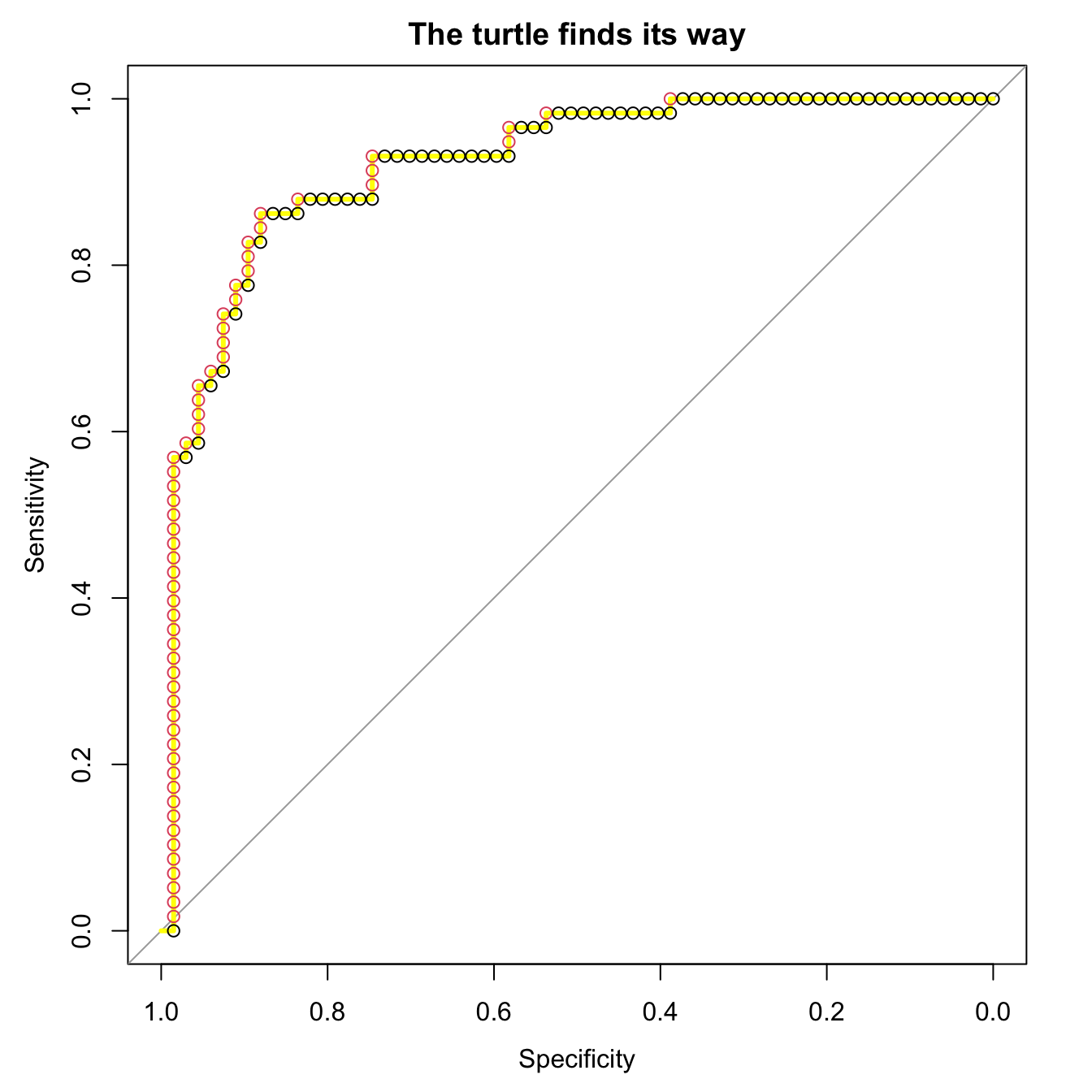 ggtitle("Both link and response scores put cases in the same order")Here the ROC curve for the response scores from the logistic regression model is calculated with the widely used pROC package and plotted as a yellow line. The simple_roc function was also used to calculate an ROC curve, but in this case it is calculated from the link scores. Since both sets of scores put the labels in the same order, and since both functions are doing essentially the same thing, we get the same curve. The points of the simple_roc curve are plotted as open circles, which land exactly on top of the yellow line. Each point represents a single case in the test set, and the outline colors of the circles show whether that case was a “bad widget” (red) or not (black). Red circles tell the turtle to go North, and black circles tell it to go East.