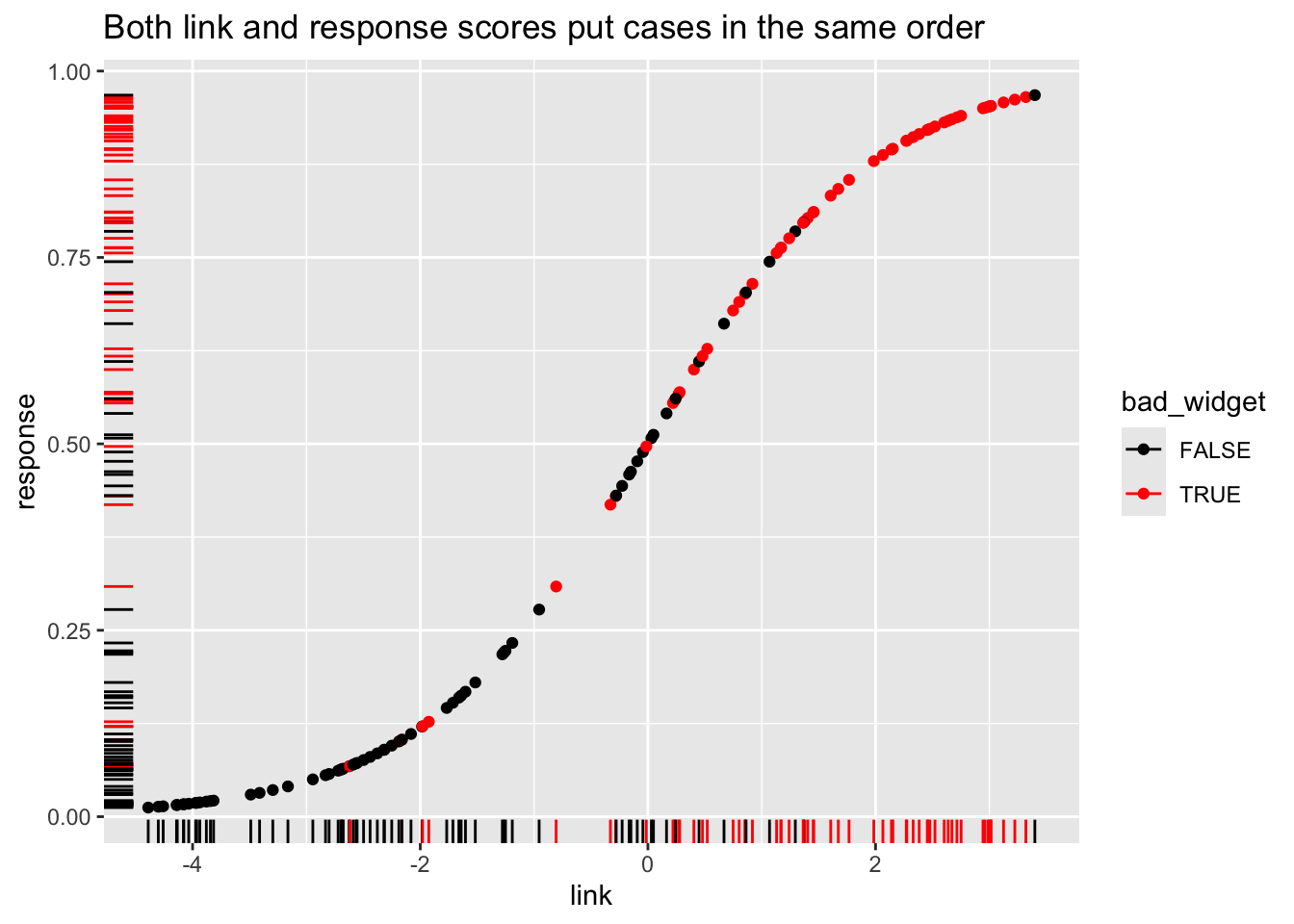 We use the training set to fit a logistic regression model using the x feature to predict whether a given widget is likely to be bad. This model will be used to generate scores for the test set, which will be used together with the actual labels of the test cases to calculate ROC curves. The values from the scores vector will not appear in the plot; they are only used to sort the labels. Two classifiers that put the labels in the same order will have exactly the same ROC curve regardless of the absolute values of the scores. This is shown by comparing the ROC curve you get using either the ‘response’ or the ‘link’ predictions from a logistic regression model. The ‘response’ scores have been mapped into the range between 0 and 1 by a sigmoid function and the ‘link’ scores have not. But either of these scores will put the points in the same order.