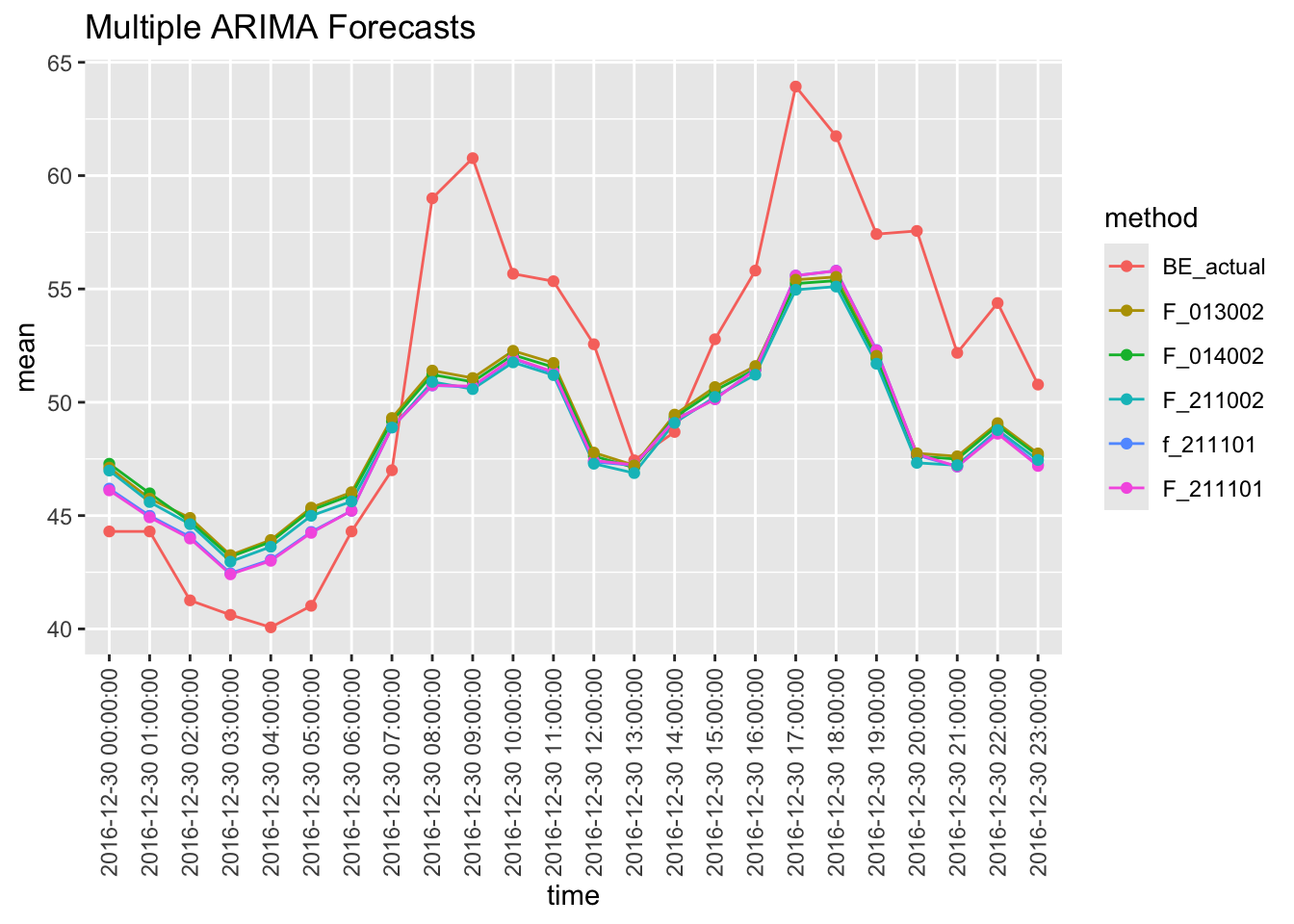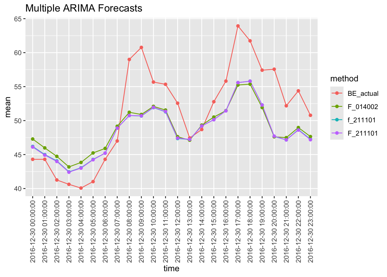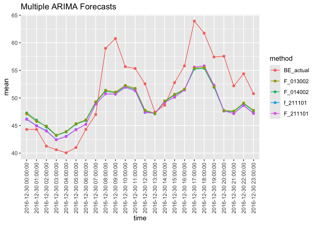 compare_fore(arima_fcst_df)To be on the safe side, I thought it was worthwhile checking to see that fable also agrees with the forecast package that an ARIMA(2,1,1)(1,0,1)[24] model is also a reasonable fit to the data. I use the fable package to fit the ARIMA(0,1,4)(0,0,2)[24] model discovered by the forecast package to the data. First, fit the ARIMA(2,1,1)(1,0,1)[24] model to the data.