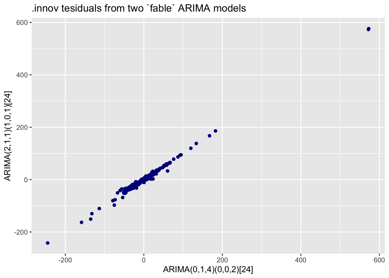 Next, to get an idea of how good these forecasts are relative to each other I check the residuals. The following plot shows that the residuals of the two fable ARIMA forecasts are very highly correlated.