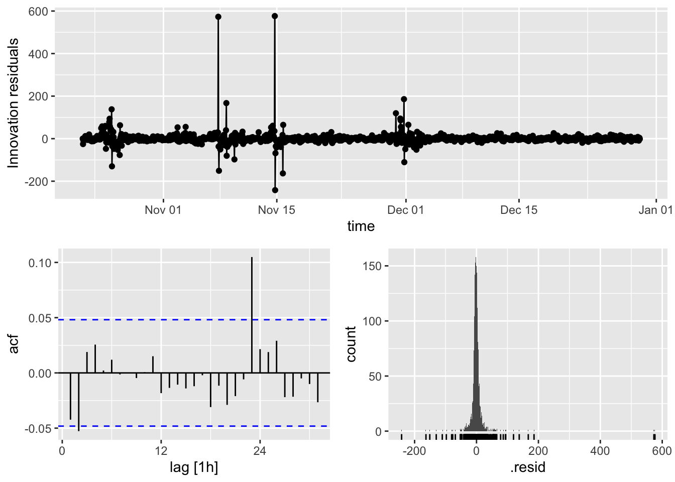 ggtitle(".innov tesiduals from two `fable` ARIMA models")Let’s look at the residuals for the ARIMA(2,1,1)(1,0,1)[24] model in some detail. The plot of the innovative residuals looks like white noise, but the ACF plot shows a large spike at lag 23 and the distribution of the residuals has too sharp of a peak to be normal.