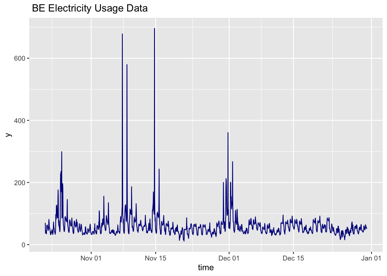 As in the TimeGPT post, I will use the BE electricity usage data set from the nixtlar package for fitting models and making forecasts. A plot of the data shows that the dime series seems to have some cyclic behavior punctuated by periods of extreme volatility.