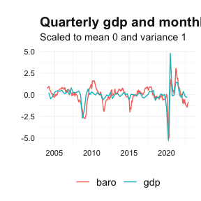 bridgr v0.1.1: Implements bridge models for nowcasting and forecasting macroeconomic variables by linking high-frequency indicator variables (e.g., monthly data) to low-frequency target variables (e.g., quarterly GDP). See Baffigi et al. (2004), Burri (2023), or Schumacher (2016) for background and README to get started.