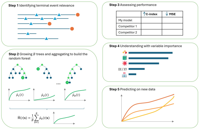 recforest v1.0.0: Extends the random survival forest algorithm by adapting splitting rules and node estimators to handle complexities of recurrent events and enables the analysis of recurrent events with right-censored data and the potential presence of a terminal event. See Murris et al. (2024) for the theory and the two vignettes method and predict for examples.
