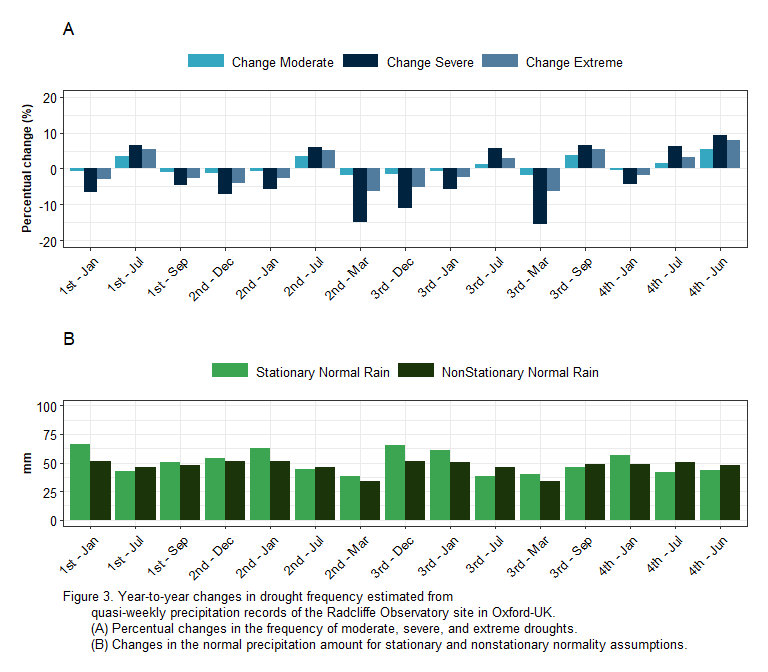 SPIChanges v0.1.0: Provides methods to improve the interpretation of the Standardized Precipitation Index under changing climate conditions. It implements the nonstationary approach of Blain et al. (2022) to detect trends in rainfall quantities and quantify the effect of such trends on the probability of a drought event occurring. There is an Introduction and a vignette Monte Carlo Experiments and Case Studies.