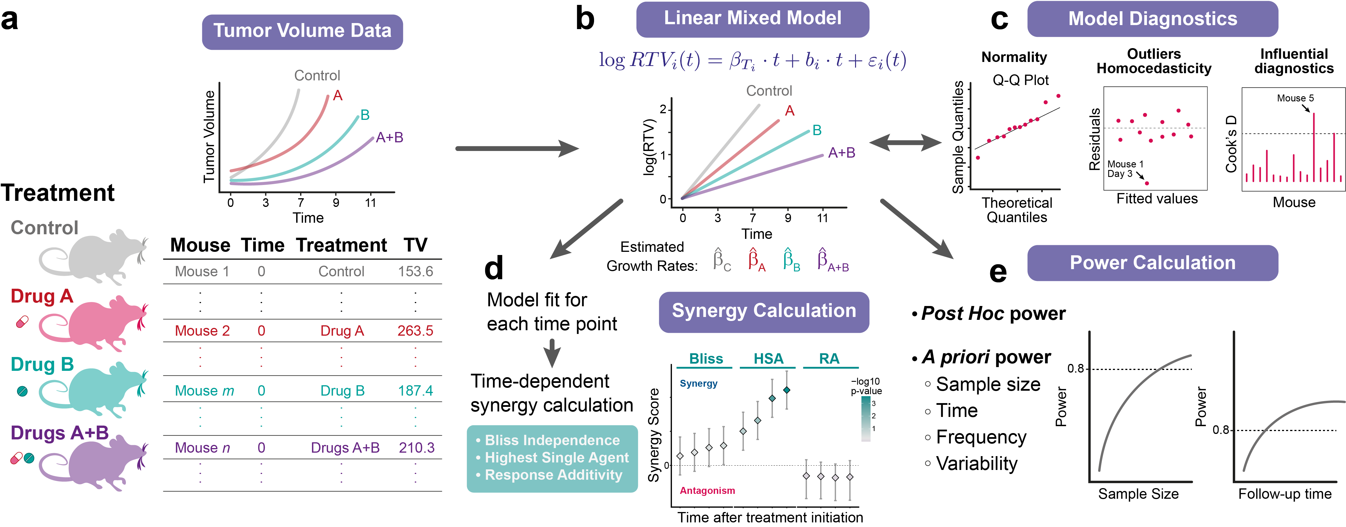 SynergyLMM v1.0.1: Implements a framework for evaluating drug combination effects in preclinical in vivo studies, which provides functions to analyze longitudinal tumor growth experiments using linear mixed-effects models, perform time-dependent analyses of synergy and antagonism, evaluate model diagnostics and performance, and assess both post-hoc and a priori statistical power. See Demidenko & Miller (2019 for the calculation of drug combination synergy and Pinheiro and Bates (2000) and Gałecki & Burzykowski (2013) for information on linear mixed-effects models. The vignette offers a tutorial.