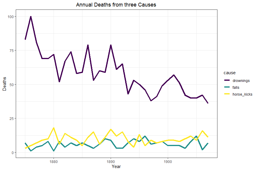 Horsekicks v1/0/2: Provides extensions to the classical dataset Death by the kick of a horse in the Prussian Army first used by Ladislaus von Bortkeiwicz in his treatise on the Poisson distribution Das Gesetz der kleinen Zahlen. Also included are deaths by falling from a horse and by drowning. See the vignette.