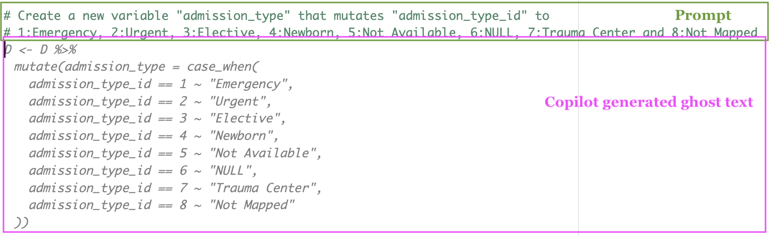 When using Copilot directly in RStudio, it is essential to provide sufficient detail in your prompts. We will begin with admission_type_id: