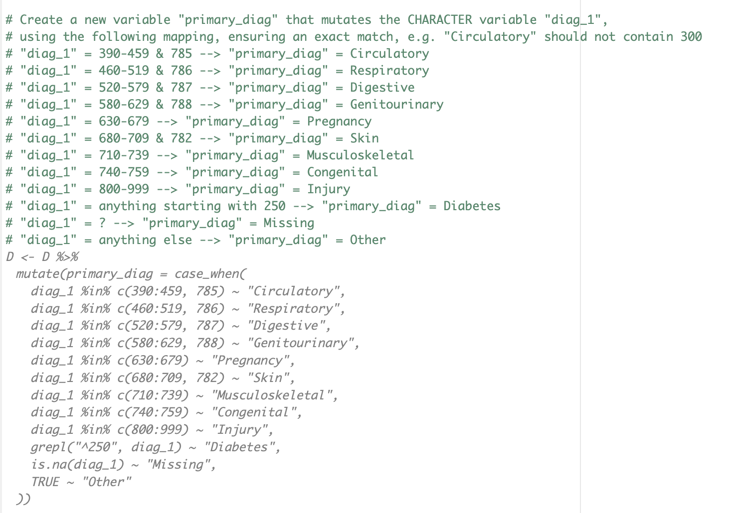 Now let’s handle the slightly more complicated diag_1, which defines primary diagnosis using ICD9 codes; see Table \(2\)here. We will need to specify the mapping very clearly, as below.