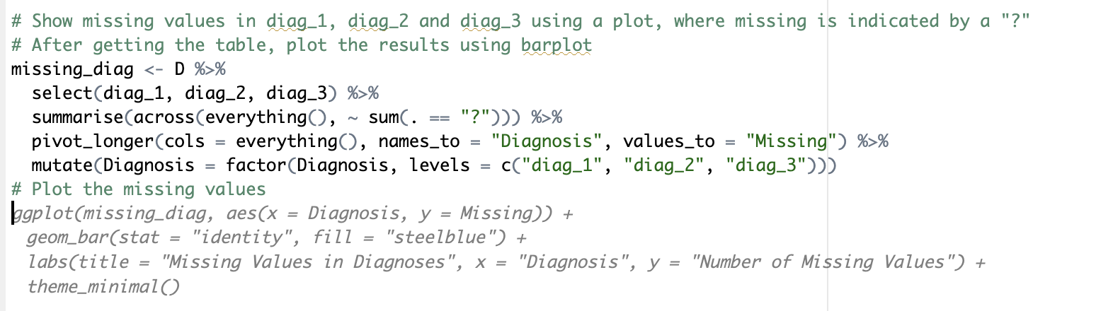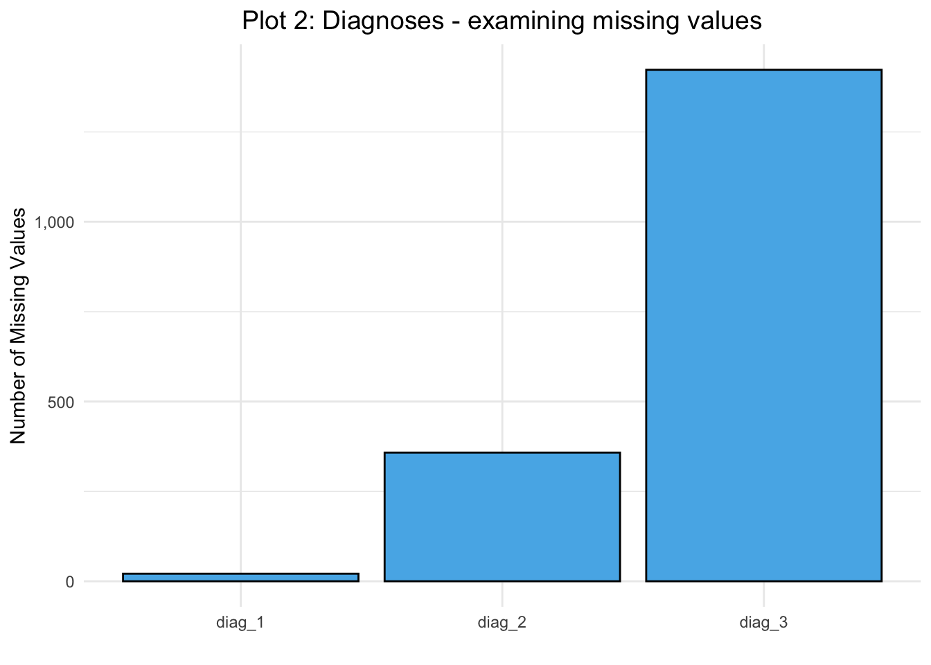 # --------------------------------------------- ## 2) Missing values for diagnoses# --------------------------------------------- #missing_diag <- D %>%select(diag_1, diag_2, diag_3) %>%summarise(across(everything(), ~sum(. =="?"))) %>%pivot_longer(cols =everything(), names_to ="Diagnosis", values_to ="Missing") %>%mutate(Diagnosis =factor(Diagnosis, levels =c("diag_1", "diag_2", "diag_3")))ggplot(missing_diag, aes(x = Diagnosis, y = Missing)) +geom_bar(stat ="identity", fill ="#56B4E9", color ="black") +labs(x ="", y ="Number of Missing Values") +theme_minimal() +labs(title ="Plot 2: Diagnoses - examining missing values") +theme(plot.title =element_text(size =14, color ="black", hjust =0.5)) +scale_y_continuous(labels =function(n) scales::comma(abs(n)))
