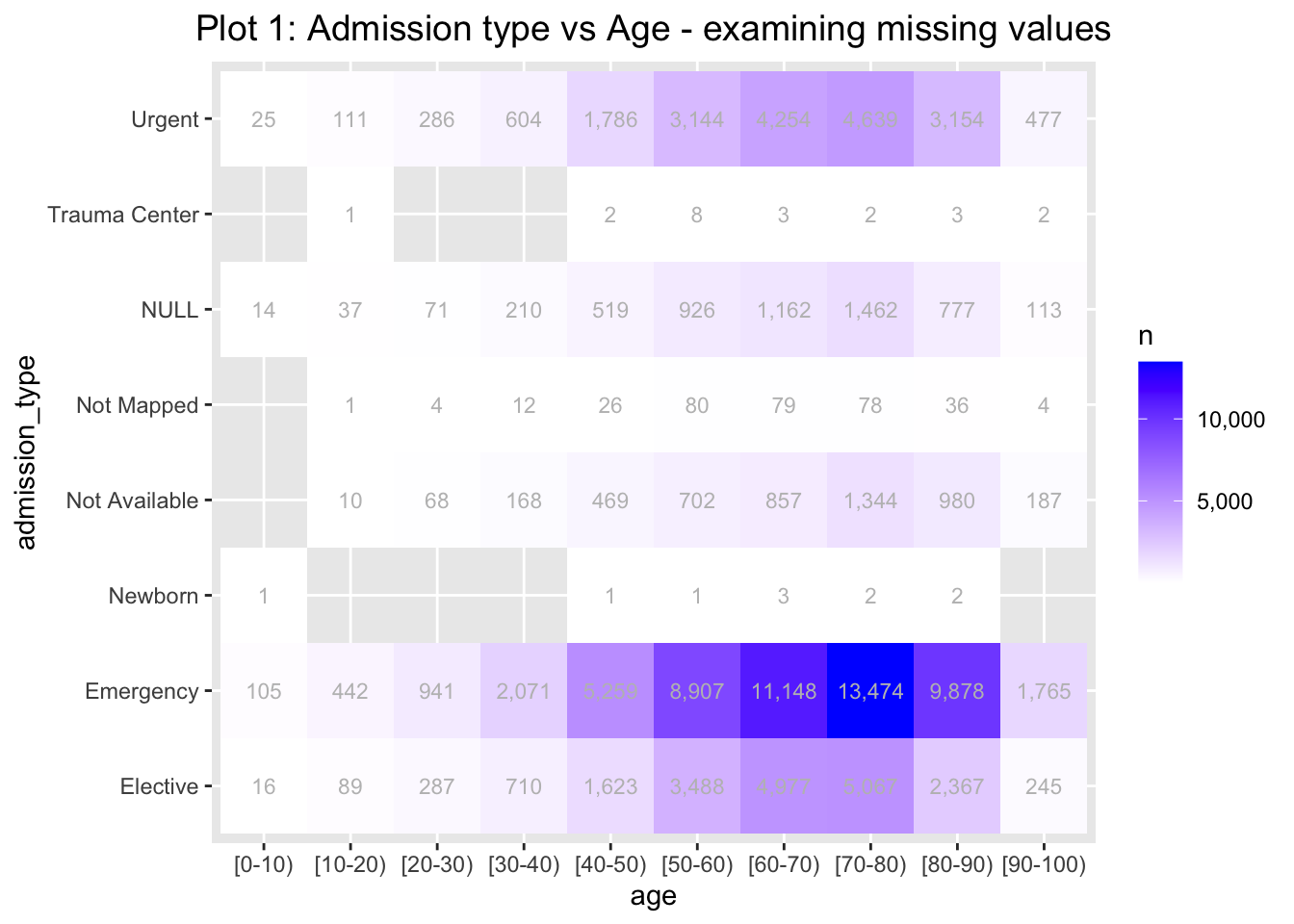 # --------------------------------------------- ## 1) Missing value vs NULL for admission type# --------------------------------------------- #p <- D %>%group_by(admission_type, age) %>%summarise(n =n()) %>%mutate(freq = n /sum(n))ggplot(p, aes(x = age, y = admission_type)) +geom_tile(aes(fill = n)) +scale_fill_gradient(low ="white", high ="blue", labels =function(n) scales::comma(abs(n))) +labs(title ="Plot 1: Admission type vs Age - examining missing values") +theme(plot.title =element_text(size =14, color ="black", hjust =0.5)) +geom_text(aes(label = scales::comma(n)), size =3, color ="gray")