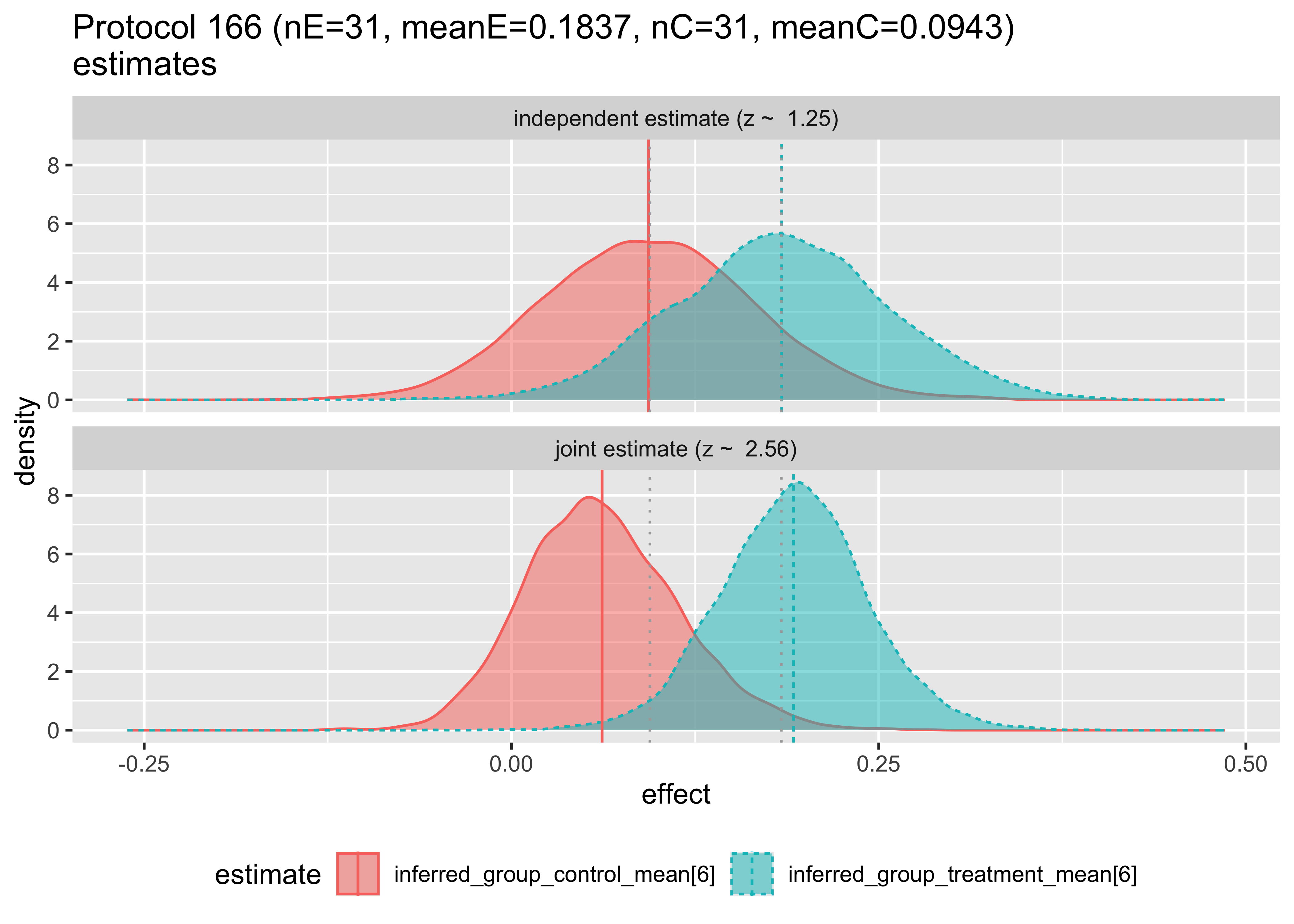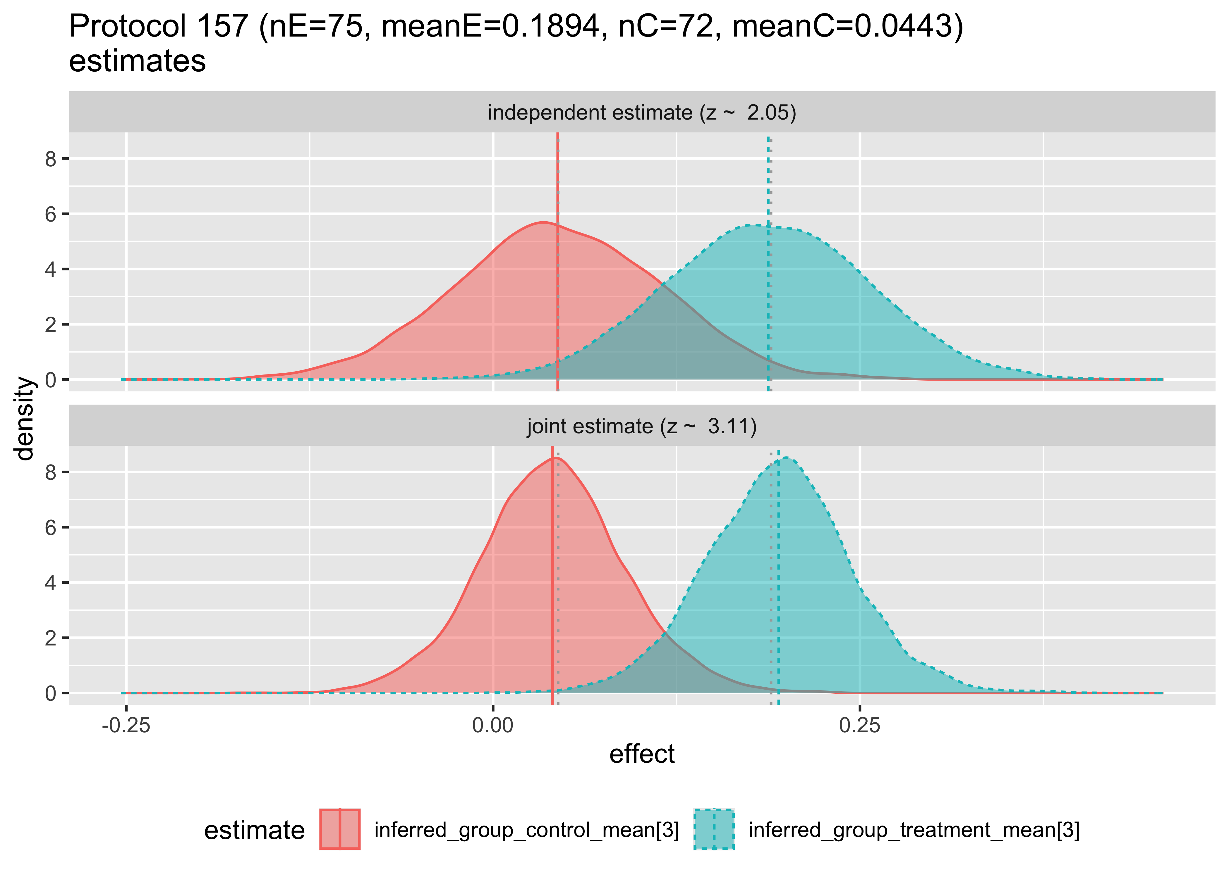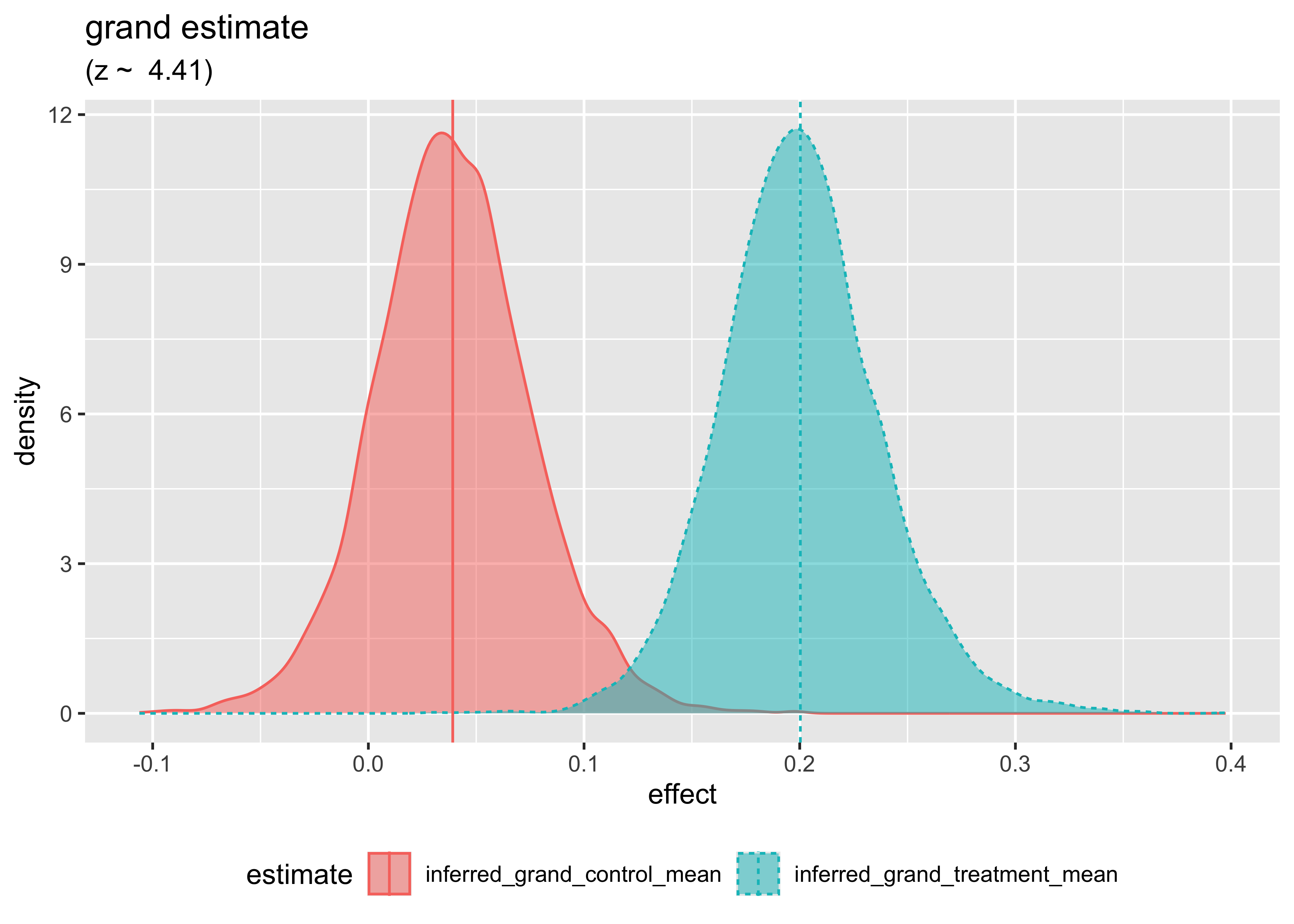 First, we plot the estimated posterior distribution of both the treatment and control effects. This is the final result of the analysis, using all of the data, simulated from the eight trials. In this result, high-variance studies have a diminished influence on the overall estimated effect sizes. Running all of the simulated data together without maintaining the trial structure would produce an inflated 0.2 again.