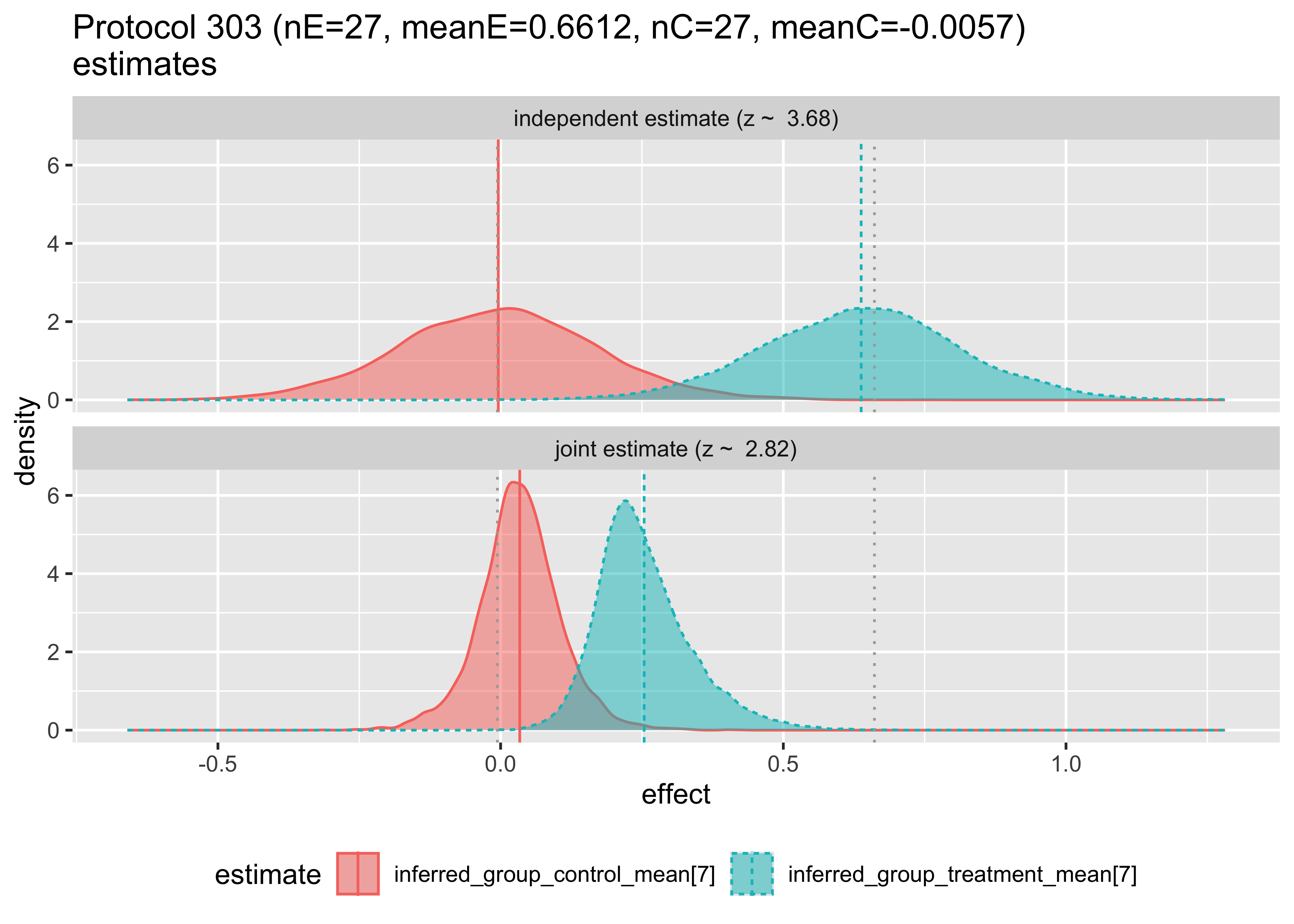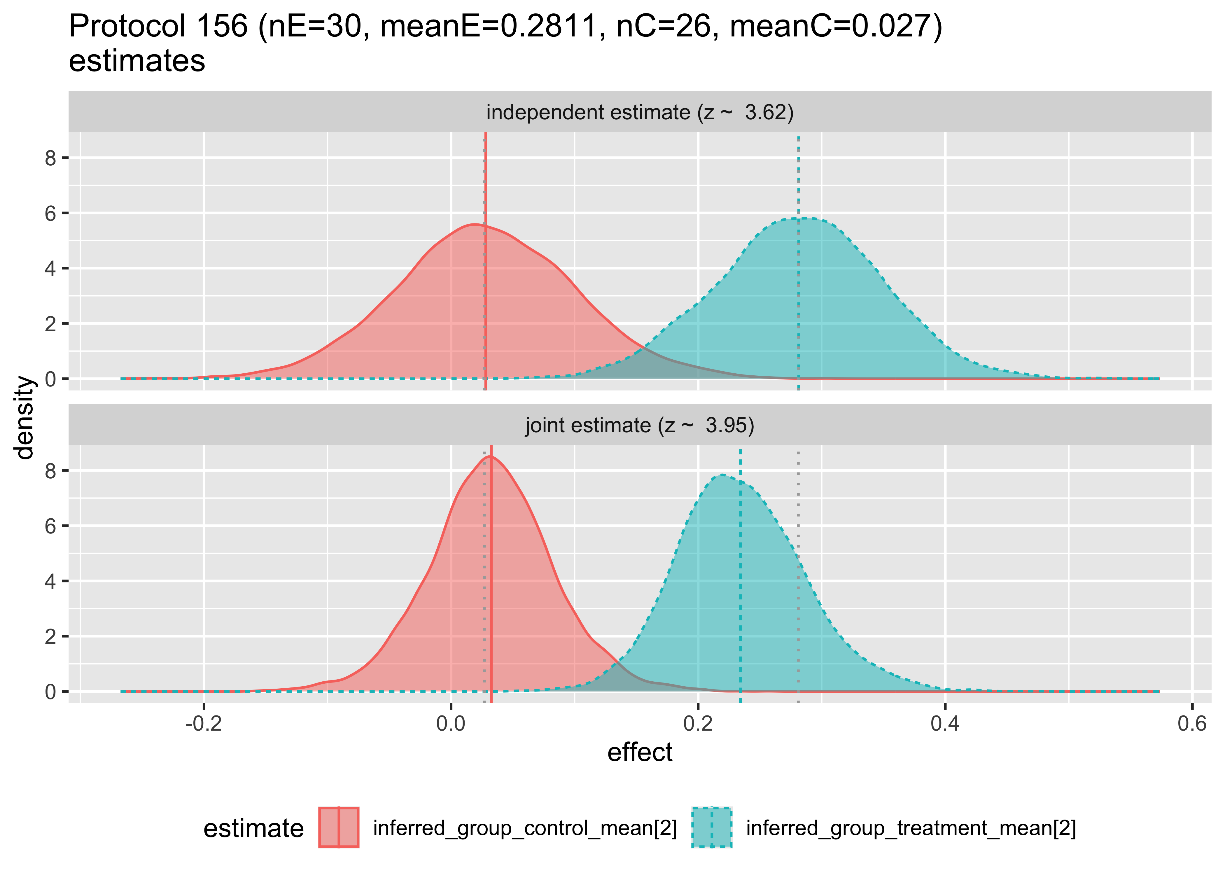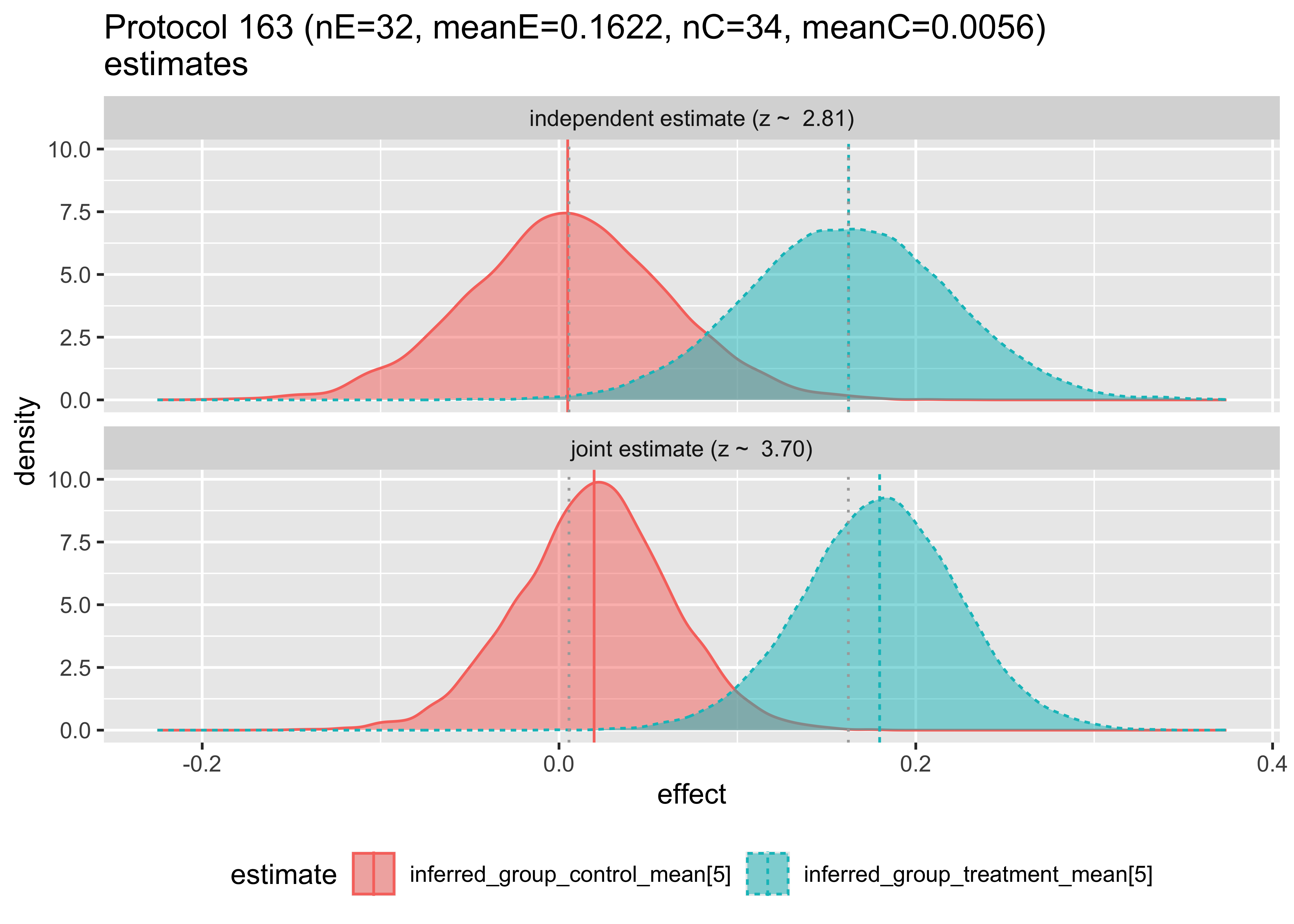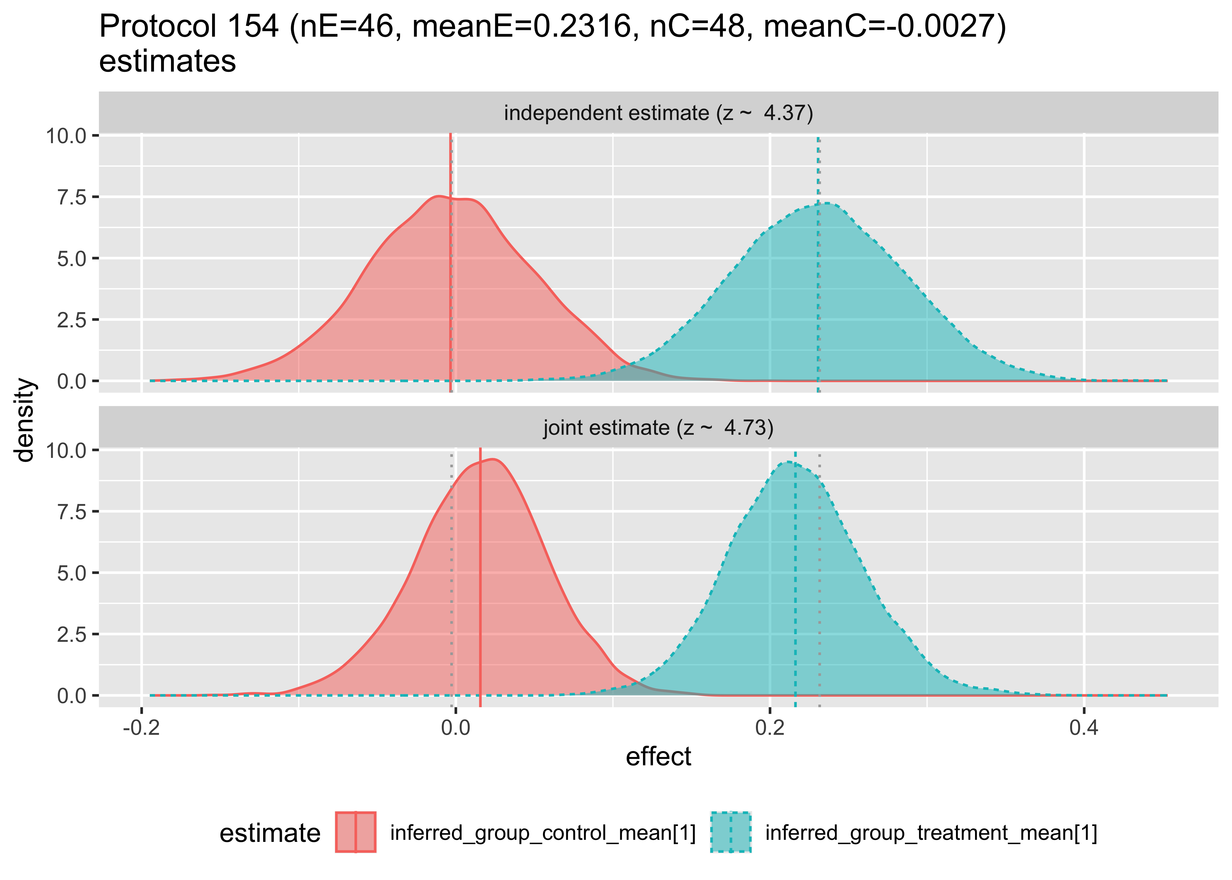 # run the sampling procedurefit_joint <-run_cached( stan,list(model_code = analysis_src_joint, # Stan programdata = stan_data, # named list of datachains =4, # number of Markov chainswarmup =2000, # number of warm up iterations per chainiter =4000, # total number of iterations per chaincores =4, # number of cores (could use one per chain)refresh =0, # no progress shownpars =c("lp__", # parameters to bring back"inferred_grand_treatment_mean", "inferred_grand_control_mean", "inferred_between_group_stddev","inferred_group_treatment_mean", "inferred_group_control_mean","inferred_in_group_stddev", "sampled_meanE", "sampled_varE","sampled_meanC", "sampled_varC") ),prefix ="Amlodipine_joint")