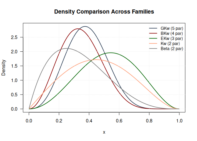 gkwdist v1.1.1: Implements the five-parameter Generalized Kumaraswamy distribution proposed by Carrasco, Ferrari and Cordeiro (2010) and its seven nested sub-families for modeling bounded continuous data on the unit interval (0,1). Provides density, distribution, quantile, and random generation functions, along with analytical log-likelihood, gradient, and Hessian functions. See the Introduction and the vignette on Statistical Properties.