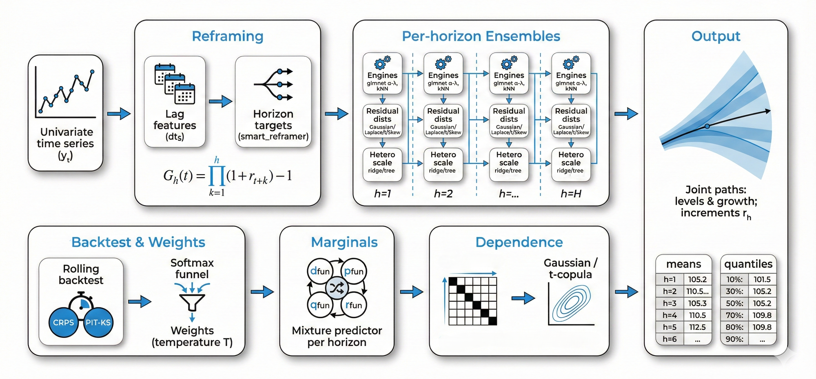 organik v1.0.1: Provides functions to train per-horizon probabilistic ensembles from a univariate time series. It supports rpart, glmnet, and kNN engines with flexible residual distributions and heteroscedastic scale models, weighting variants by calibration-aware scores. A Gaussian/t copula couples the marginals to simulate joint forecast paths, returning quantiles, means, and step increments across horizons. Look here for the details.