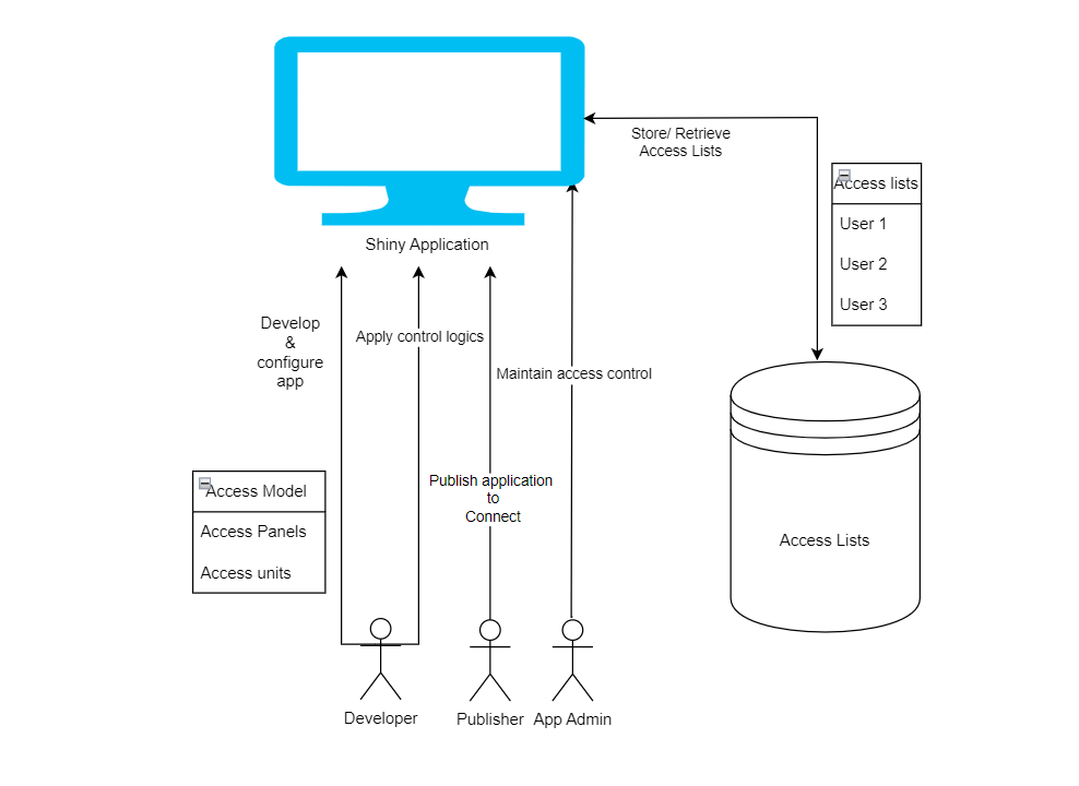 rAccess v0.1.1.3: Provides a framework for implementing hierarchical access control in shiny applications. Features include user permission management through a two-tier system of access panels and units, pluggable shiny module for administrative interfaces, and support for multiple storage backends (local, AWS S3, Posit Connect). The system enables fine-grained control over application features, with built-in audit trails and user management capabilities. See the Tutorial.