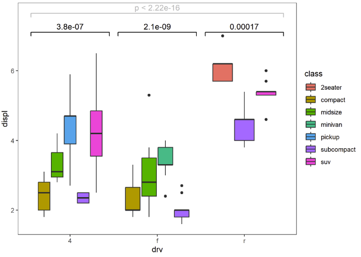 ggcompare v0.0.2: Add mean comparison annotations to a ggplot to indicate if two or more groups are significantly different. For comparisons between two groups, the p-value is calculated by t-test (parametric) or Wilcoxon rank sum test (nonparametric). For comparisons among more than two groups, the p-value is calculated by One-way ANOVA (parametric) or Kruskal-Wallis test (nonparametric). Look here for examples.