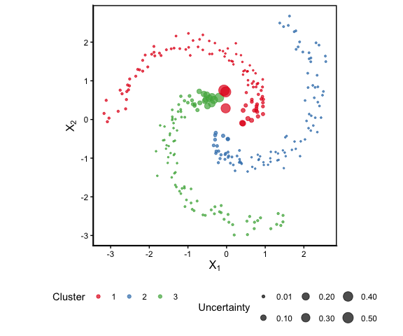 Plot showing fuzzy spectral clustering of spiral data