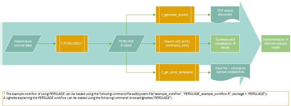PERSUADE v0.1.2: Provides a standardized framework to support the selection and evaluation of parametric survival models for time-to-event data. Includes tools for visualizing survival data, checking proportional hazards assumptions (Grambsch and Therneau (1994)), comparing parametric (Ishak et al. (2013)), spline (Royston and Parmar (2002)) and cure models, examining hazard functions, and evaluating model extrapolation. Methods are consistent with recommendations in the NICE Decision Support Unit Technical Support Documents 14 and 21. See README to get started.
