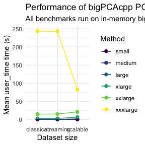 bigPCAcpp v0.9.0: Implements high performance principal component analysis routines that operate directly on bigmemory::big.matrix objects. Functions avoid materializing large matrices in memory by streaming data through BLAS and LAPACK kernels and include helpers to derive scores, loadings, correlations, and diagnostics, and include utilities to stream results into bigmemory matrices for file-based workflows. Also implemented is the Scalable principal component analysis of Elgamal et al. (2015). There is an Introduction and a vignette on Benchmarking.
