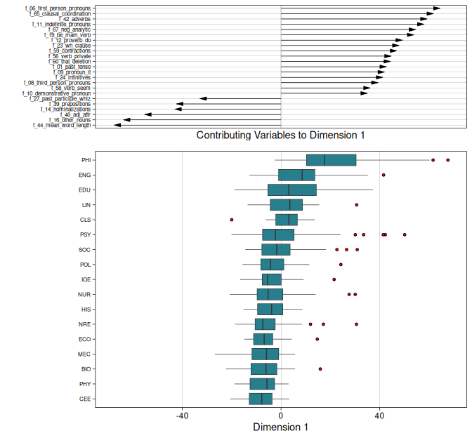 mda.biber v1.0.1: Implements the factor analysis developed in Biber (1992) most commonly used to describe language as it varies by genre, register, and use. Functions describe and plot MDA results, including dimension scores, dimension means, and factor loadings. See the vignette for an introduction.