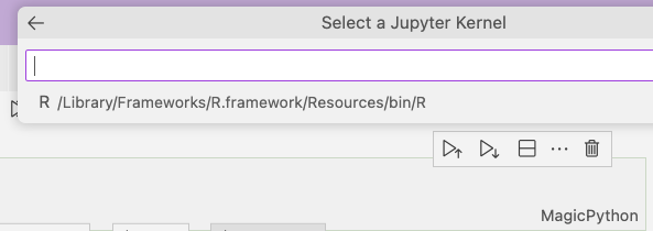 IRkernel::installspec() # to register the kernel, making it visible to Jupyter.Now restart VS Code and create a Jupyter Notebook from the New File... menu item. To switch to the R kernel, click the “Select Kernel” button above the notebook to the right. Then, in the menu-bar popup, select the R executable, and the “MagicPython” dropdown menu on the notebook cell will change to R. If no R kernel is shown, Choose “Select Another Kernel…” to search the file system for one. Once you’ve found one, it will appear next time in the kernel selection menu.