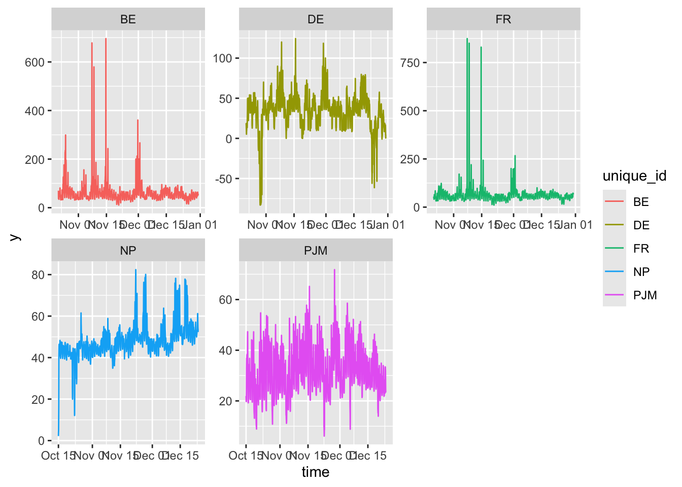 Plots indicate that all of the series show periods of considerable volatility. The BE, DE, and FR series appear to be stationary. NP trends upward to the right, and the PJM series appears to be nonlinear.